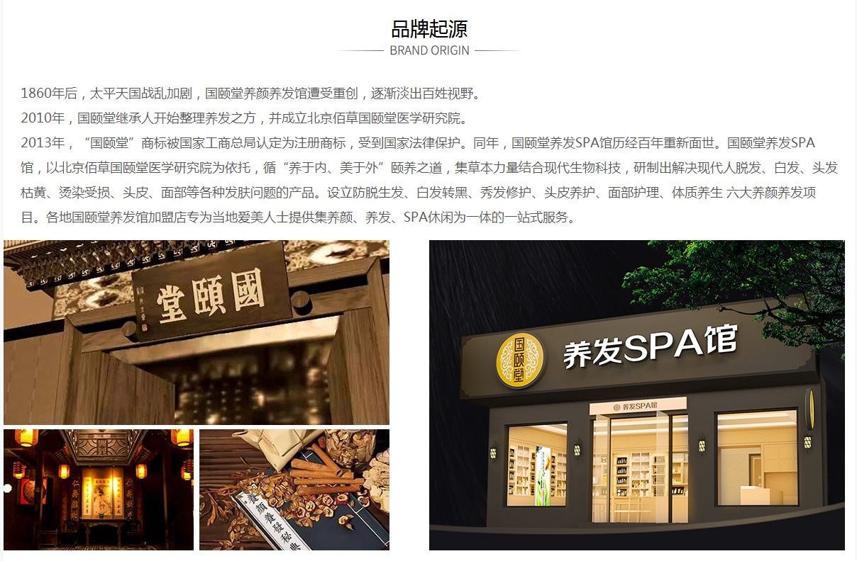 国颐堂养发SPA馆,以北京佰草国颐堂医学研究院为依托,循“养于内、美于外”颐养之道,集草本力量结合现代生物科技,研制出解决现代人脱发、白发、头发枯黄、烫染受损、头皮、面部等各种发肤问题的产品。设立防脱生发、白发转黑、秀发修护、头皮养护、面部护理、体质养生六大养颜养发项目。各地国颐堂养发馆加盟店专为当地爱美人士提供集养颜、养发、SPA休闲为一体的一站式服务。